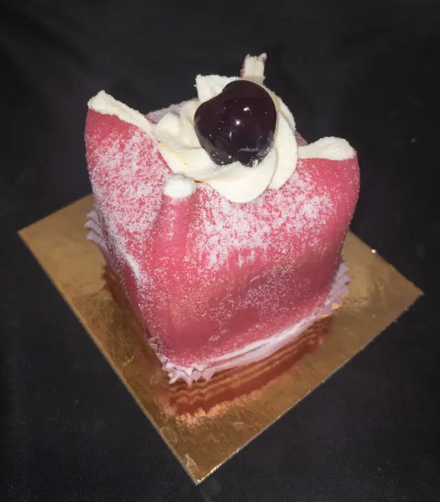 Opera gebakje, gevuld met vanille crème, cake en frambozen jam. Omhuld met marsepein