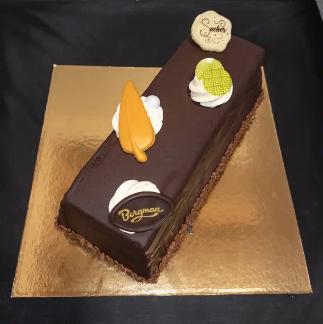 traditionele sacher cake gevuld met chocolade crème. frambozen confituren, en overgoten met pure chocolade.
